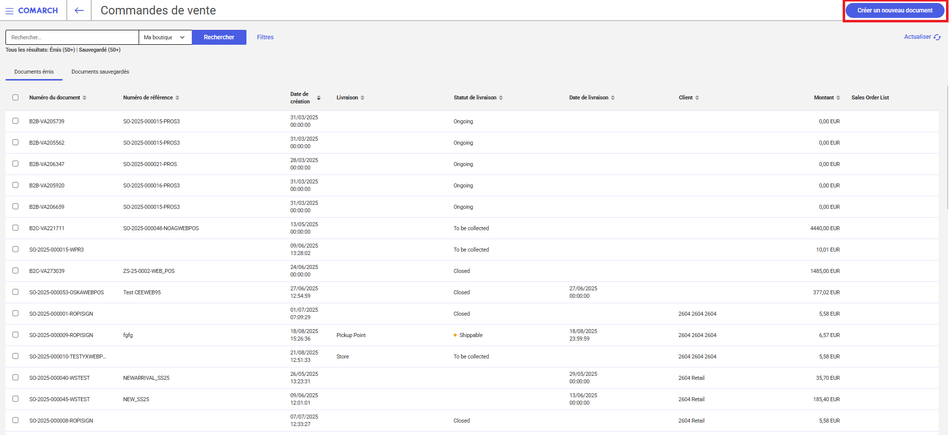 Pour créer une nouvelle commande, il faut sélectionner le bouton [Créer une nouveau document] dans la liste des commandes de vente.