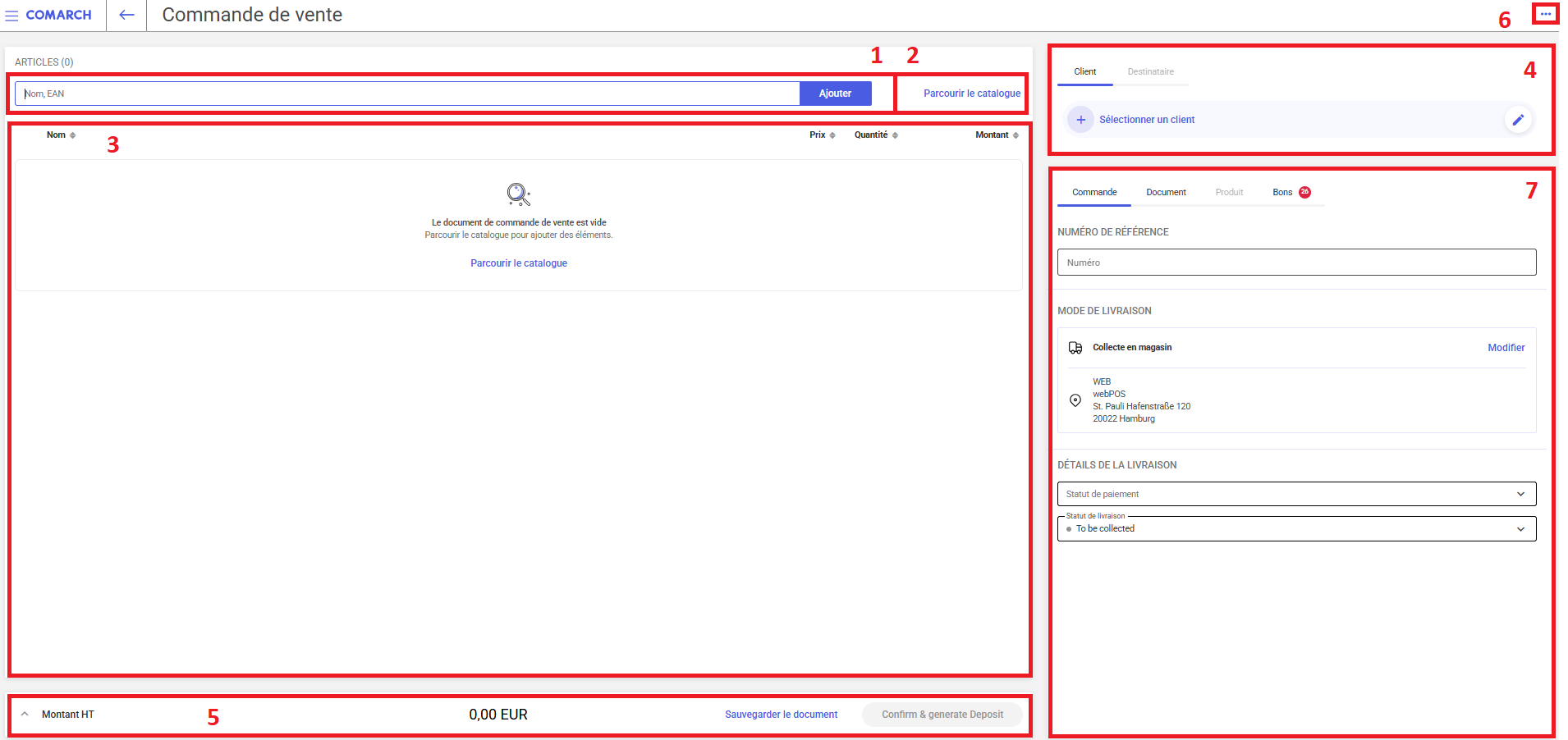 Le formulaire de nouvelle commande comprend les champs suivants (les champs individuels correspondent aux points sélectionnés sur la capture d’écran) :