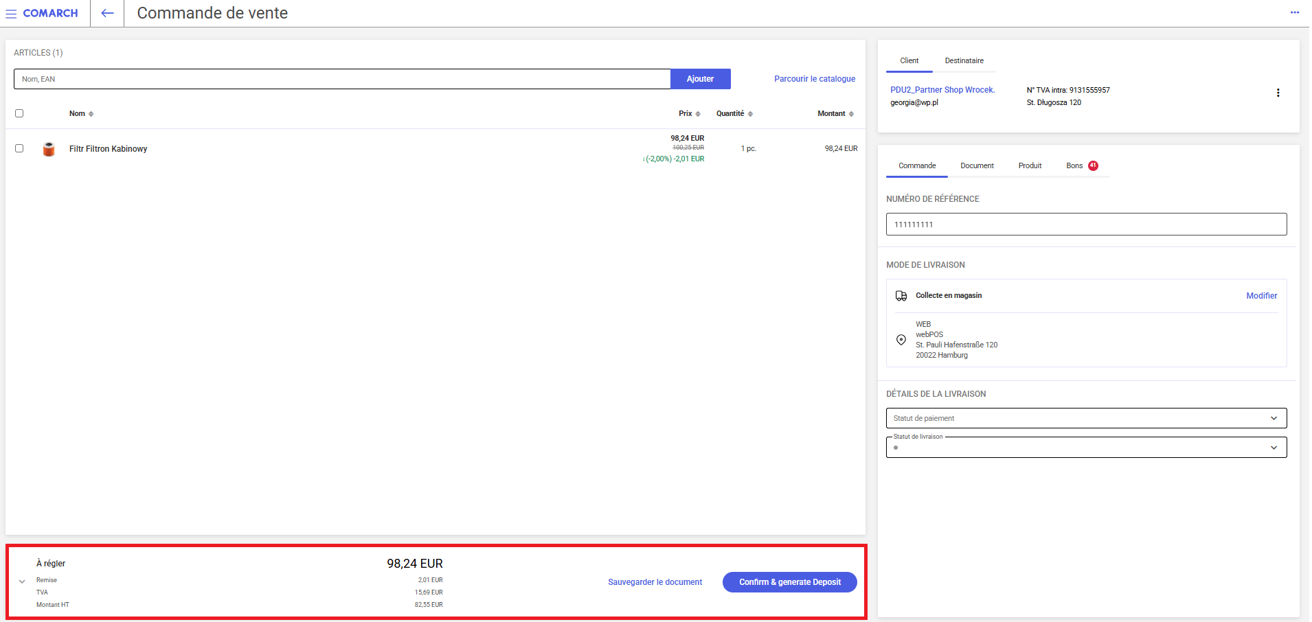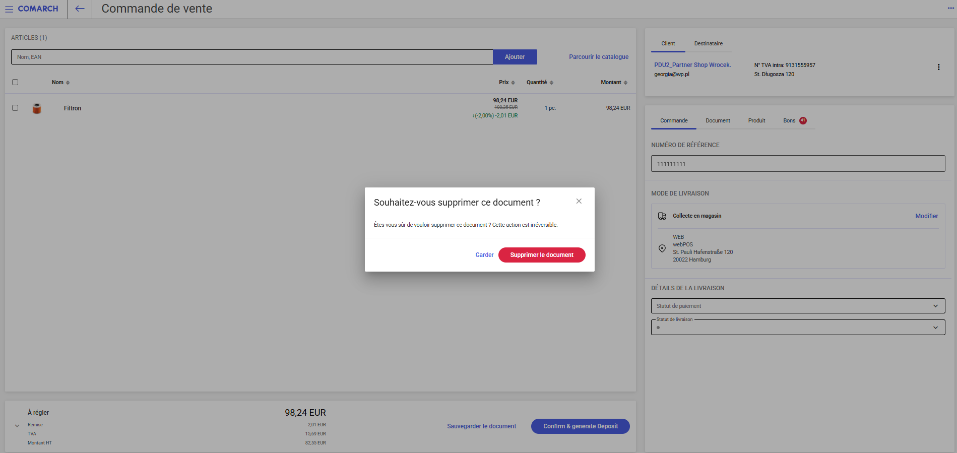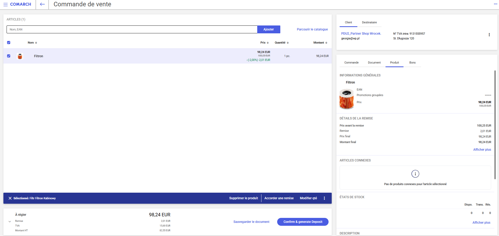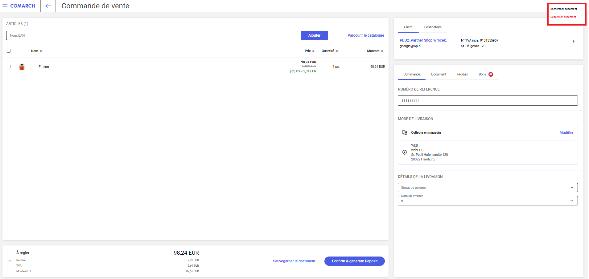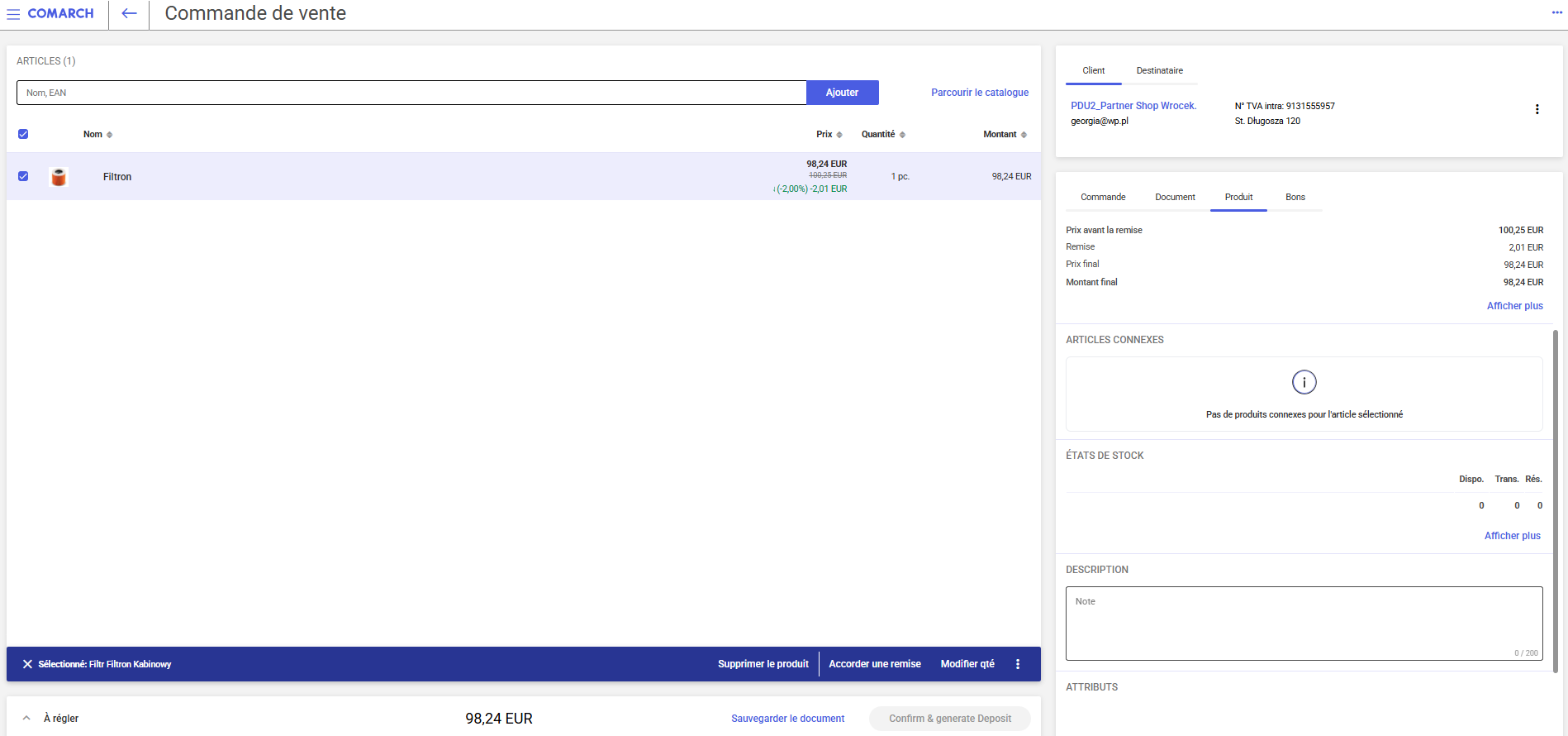 - [Supprimer le produit] – suppression de l’article sélectionné du document