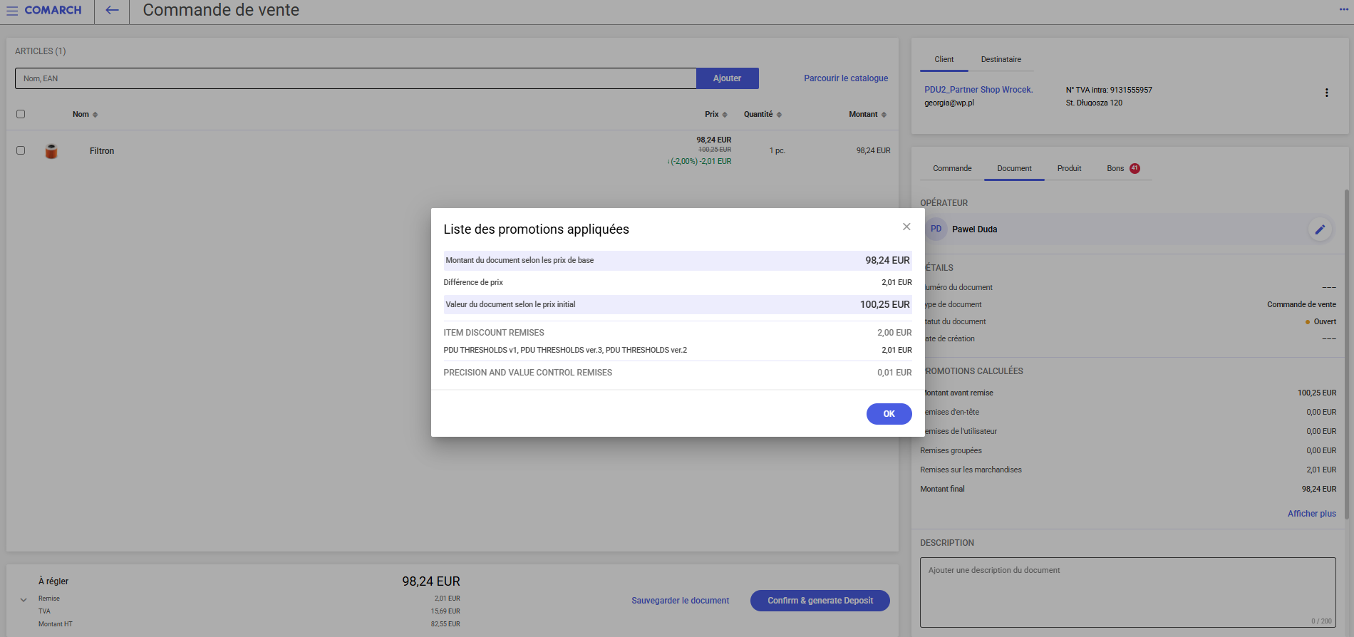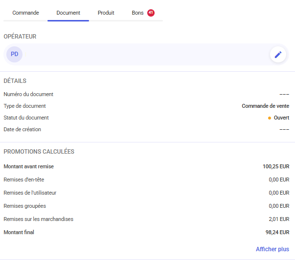 Les promotions appliquées sont répertoriées ci-dessous, avec des informations sur les remises accordées sur le document. Après avoir sélectionné le bouton [Afficher plus], le système affiche une fenêtre contenant des informations détaillées sur les remises accordées et la valeur du document.