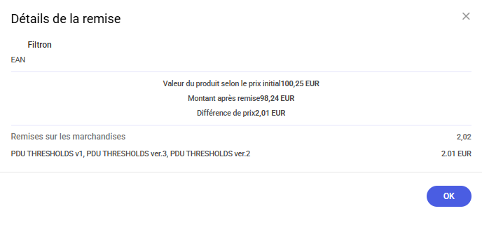 La section de détail des remises permet à l’utilisateur de consulter les détails des remises appliquées à l’article sélectionné. Le bouton [Afficher plus] ouvre une fenêtre contenant des informations détaillées sur toutes les promotions appliquées.