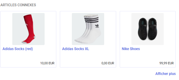 La section Articles connexes affiche jusqu’à trois produits liés à l’article sélectionné. S’il y en a plus, ils peuvent être consultés à l’aide du bouton [Afficher plus], qui ouvre une fenêtre contenant la liste complète des articles connexes. En cliquant sur le nom d’un article connexe sélectionné, l’utilisateur est redirigé vers l’aperçu de sa fiche.