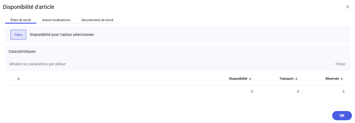 La section États de stock permet de consulter les stocks disponibles pour cet article. Après avoir cliqué sur le bouton [Afficher plus], le système ouvre la fenêtre Disponibilité d’article.