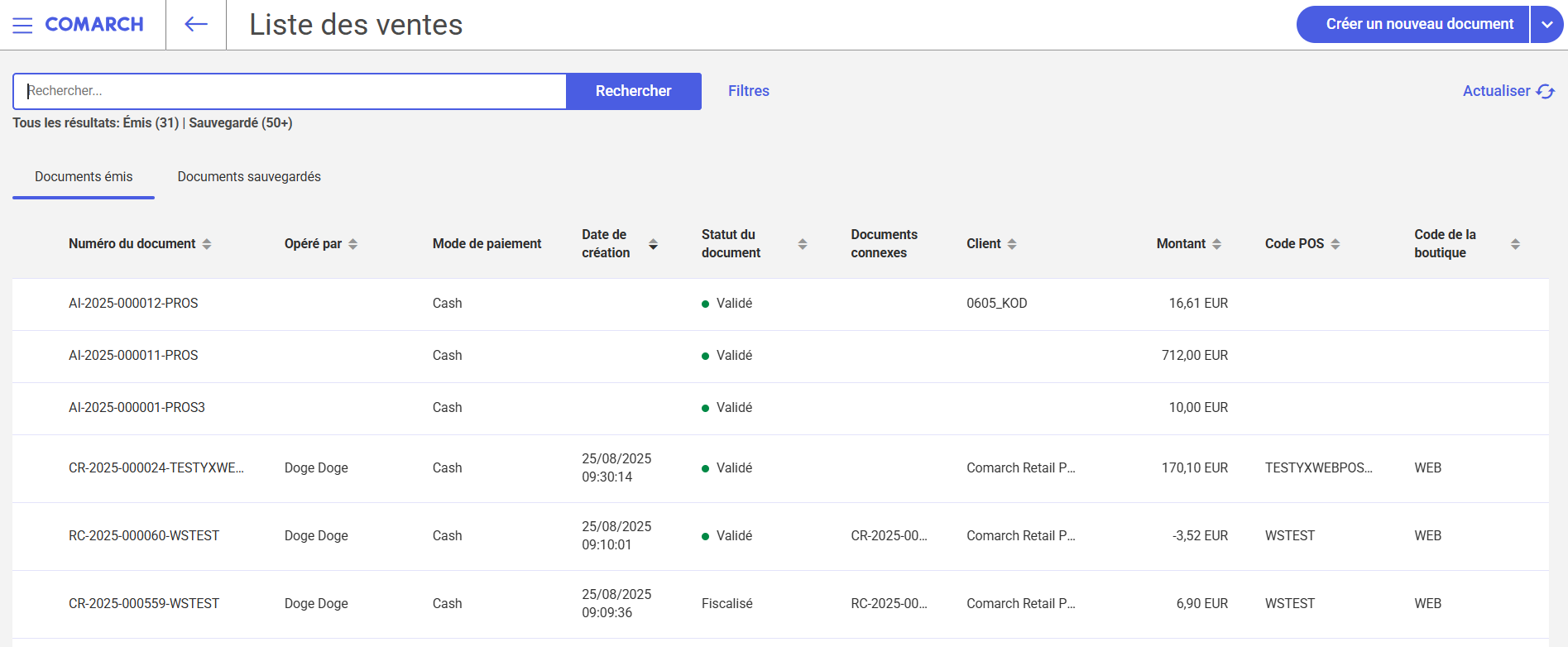 - Globalement – affichés dans toutes les boutiques. La recherche se fait dans le système ERP (uniquement pour les documents émis)