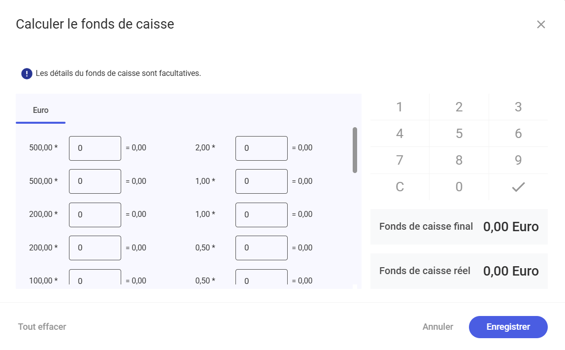 - [Calculer la caisse] – permet decalculer le fonds de caisse plus rapidement, ouvre la vue Calculer le fonds de caisse
