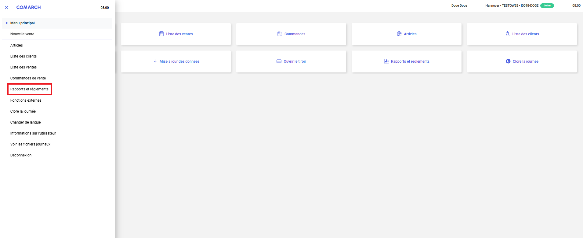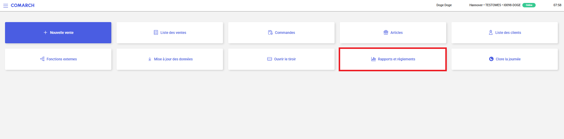 Le bouton [Rapports et réglements] est disponible depuis la fenêtre principale de l’application ou depuis le menu latéral :