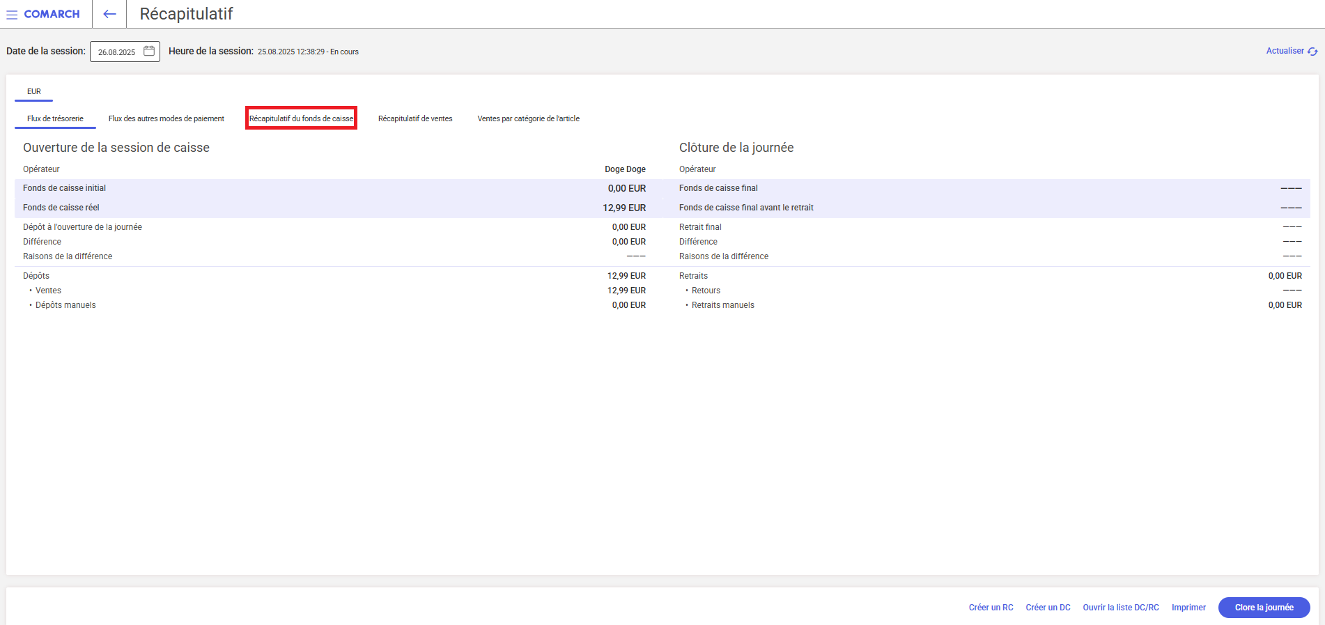 - [Clore la journée] – ouvre la fenêtre de la clôture de la journée où l’utilisateur doit vérifier le fonds de caisse réel avant de valider la clôture de la journée